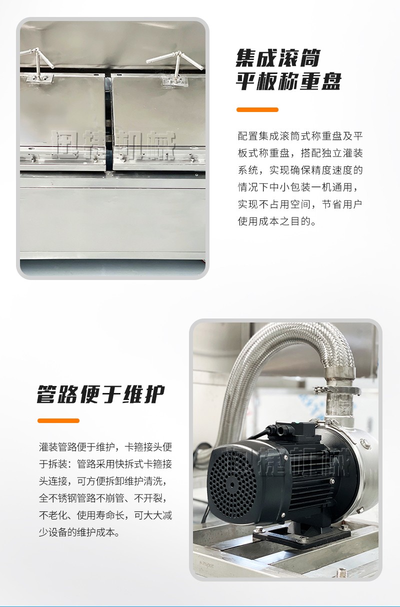 集成滾筒、平板稱重盤,一機多用,方便快捷:配置集成滾筒式稱重盤及平板式稱重盤,搭配獨立灌裝系統(tǒng),實現(xiàn)確保精度速度的情況下中小包裝一機通用,實現(xiàn)不占用空間,節(jié)省用戶使用成本之目的。
