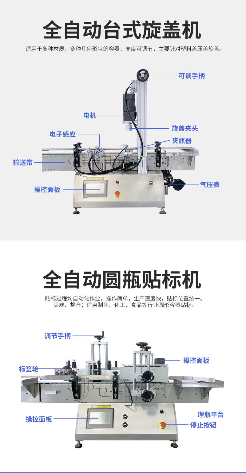 產(chǎn)品說明:桌面型膏液灌裝生產(chǎn)線根據(jù)灌裝范圍選擇型號,灌裝部分為雙頭下潛式灌裝機(jī),適用于不同物料不同瓶子的灌裝,配備自動壓蓋機(jī)和圓瓶貼標(biāo)機(jī),可實現(xiàn)不同蓋子的旋蓋貼標(biāo)工作。