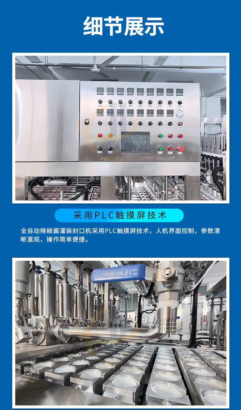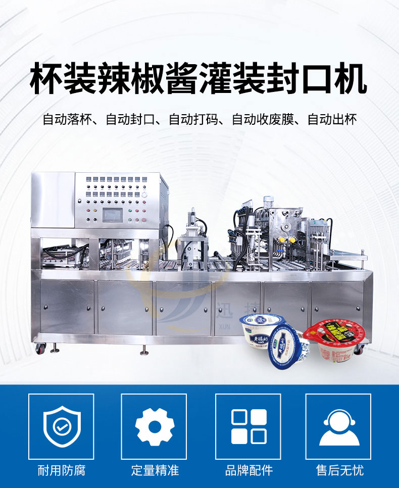 杯裝辣椒醬灌裝封口機(jī)適用于辣椒醬、黃豆醬、豆瓣醬、牛肉醬、沙拉醬等各種杯裝、盒裝等產(chǎn)品的生產(chǎn)。