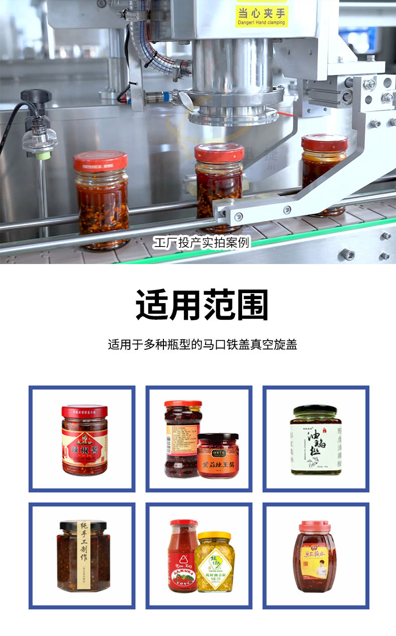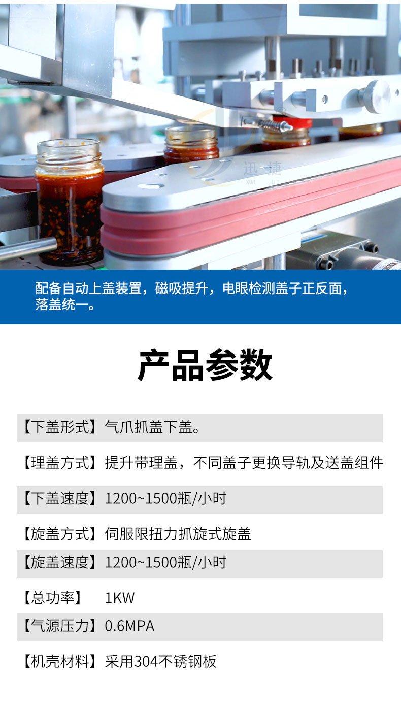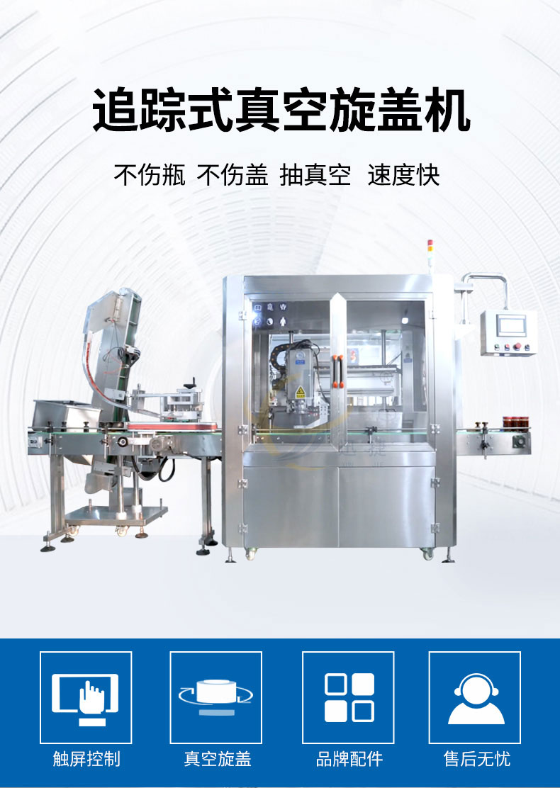 跟蹤式真空旋蓋機(jī)適用于多種瓶型的馬口鐵蓋真空旋蓋。設(shè)備由PLC結(jié)合觸摸屏控制,采用世界知名品牌電器和氣動元件,故障率低。