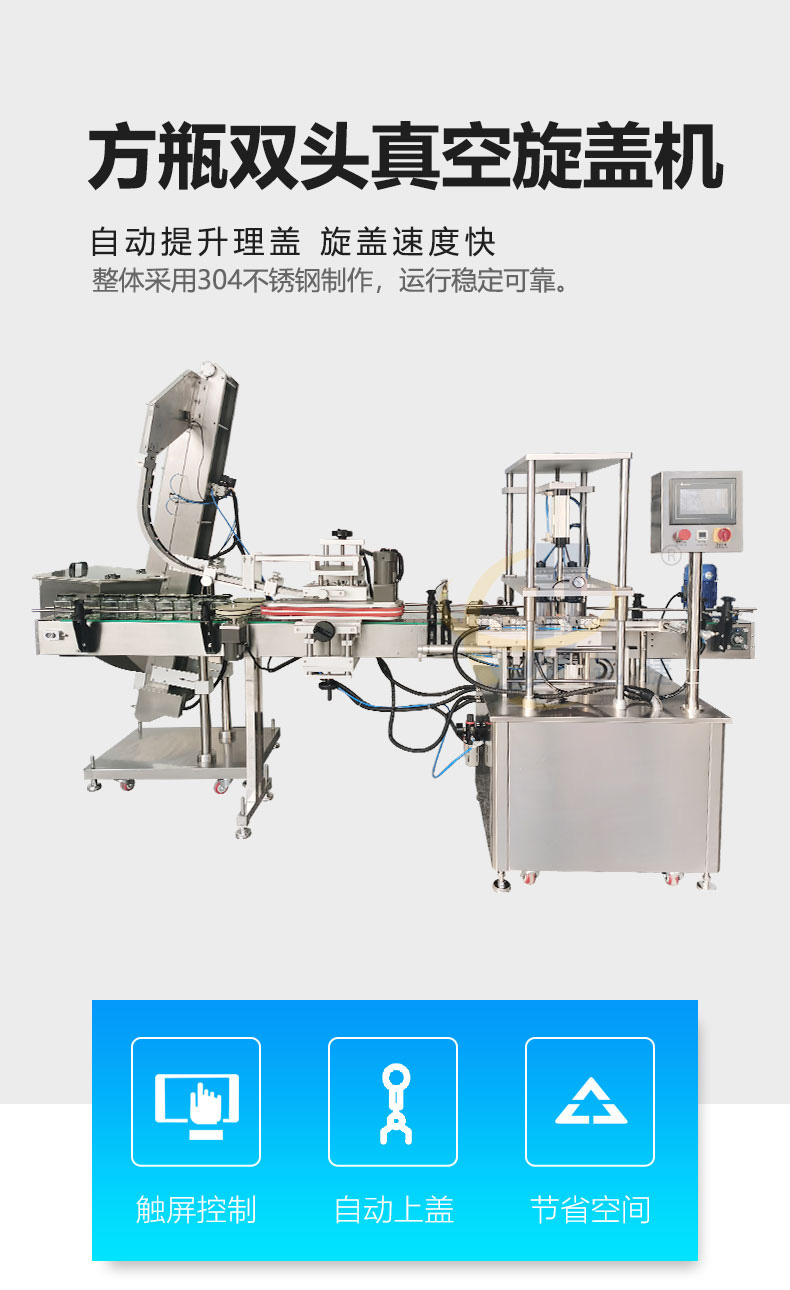 方瓶雙頭真空旋蓋機(jī)獨(dú)特的設(shè)計,可兼容多種不同形狀,尺寸的瓶子旋蓋,兼容性強(qiáng),且調(diào)整方便;真空壓力可調(diào),觸摸屏人機(jī)界面操作簡單方便。